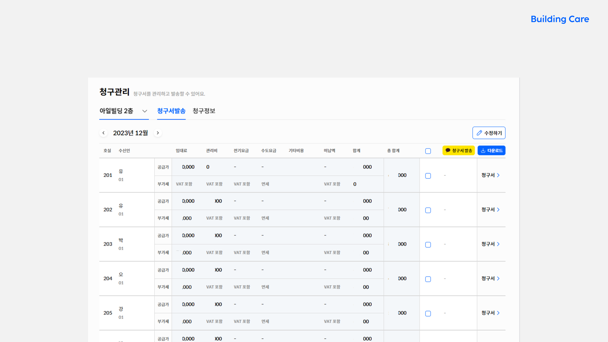 건물관리에서 가장 중요하지만 까다로운 부분이 있습니다. 바로 청구서 발송입니다. 빌딩케어의 청구서 일괄 발송 기능 덕분에 아일빌딩은 더 이상 임차인을 일일히 방문할 필요가 없습니다. 청구서 발송이 누락되어 생기는 문제가 사라지고 처리가 효율적으로 가능해지면서 기존에 청구서 관리에 쏟던 많은 시간과 노력을 아낄 수 있게 되었습니다.